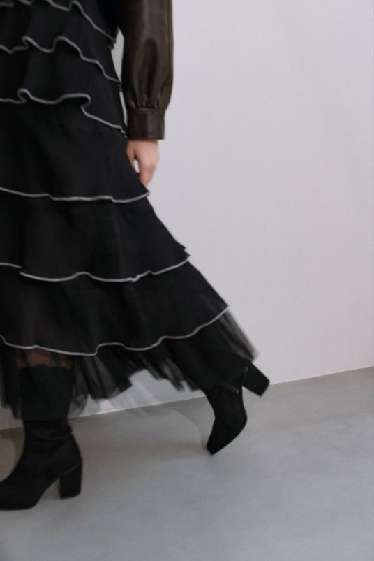 洗練されたオーラを放つスエードジャケットが目を引くコーディネート。シャンブレー生地を使用したデニムライクなブラウスとボリュームたっぷりのチュールスカートを合わせて、素材を自由に楽しむ上級者なスタイリングに。