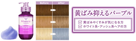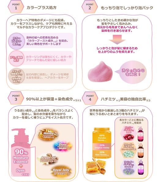カラーをプラスする染色成分はもちろん、アンドハニーの強みである「ハチミツ*1の保水力」に、ダメージ補修・褪色抑制成分などカラー後の髪に必要な成分も配合した、「染めた後も美しさが続く」を実感できるアイテムです。