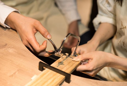 彫金職人がマンツーマンで指導。半個室の落ち着いた空間で、一生ものの指輪を自分たちの手で仕上げられます。