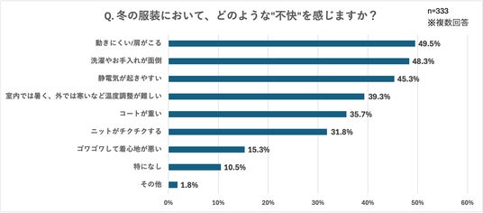また、「冬の服装において、どのような”不快”を感じますか?」という質問には、「動きにくい/肩がこる(49.5%)」と約半数の人が回答しており、さらに「冬のアウターで特に困っていることはありますか?」という質問に対しても「重い・肩がこる(39.9%)」や「着ぶくれして見える(38.7%)」など、着心地に関する悩みが多いことがわかりました。