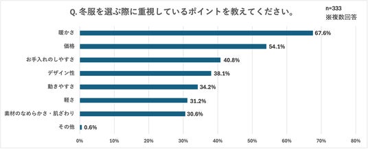 「冬服を選ぶ際に重視しているポイントを教えてください。」という設問には、「暖かさ(67.6%)」が最多となり、防寒を一番の目的とした服選びに需要があることがわかりました。