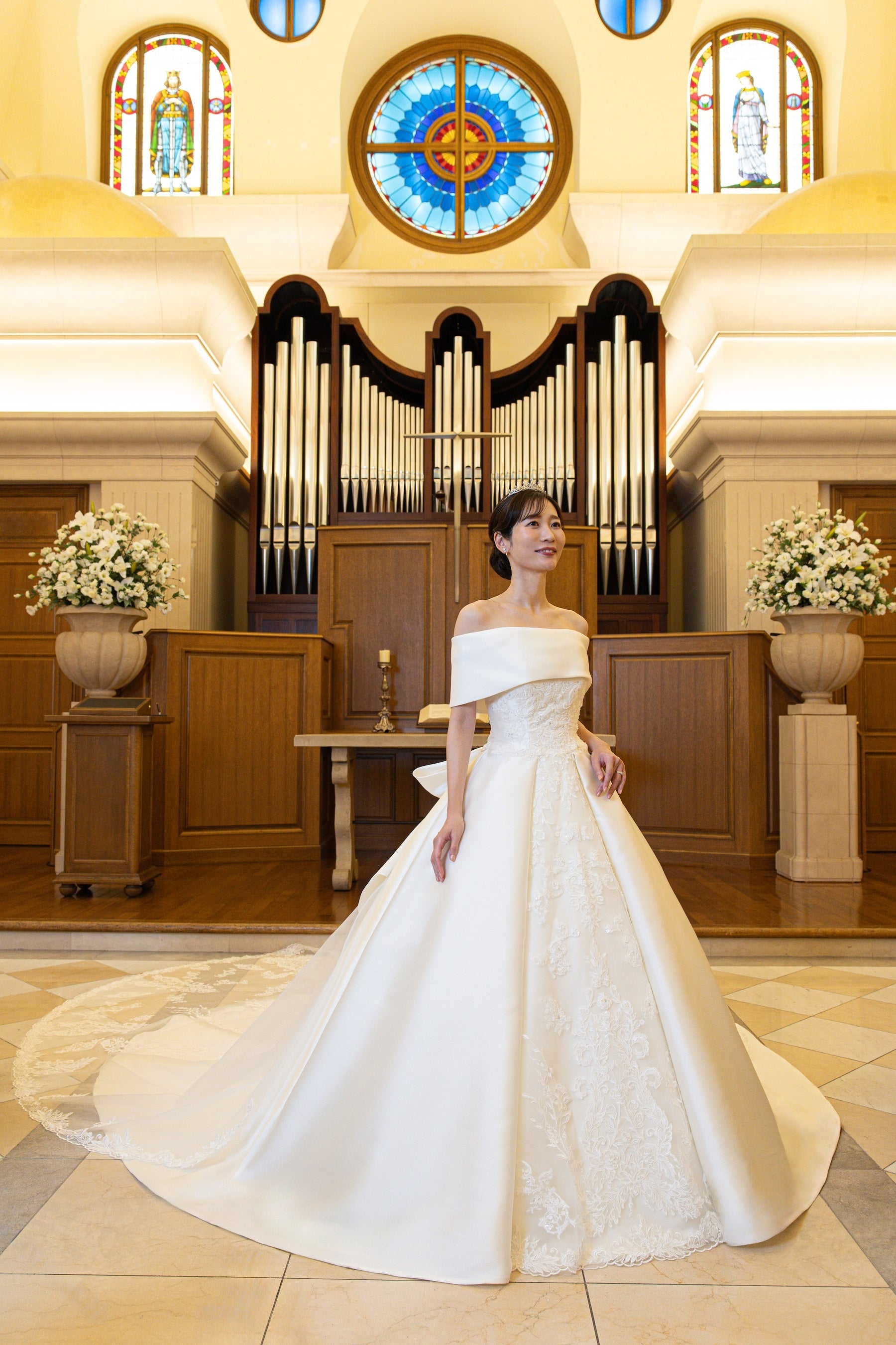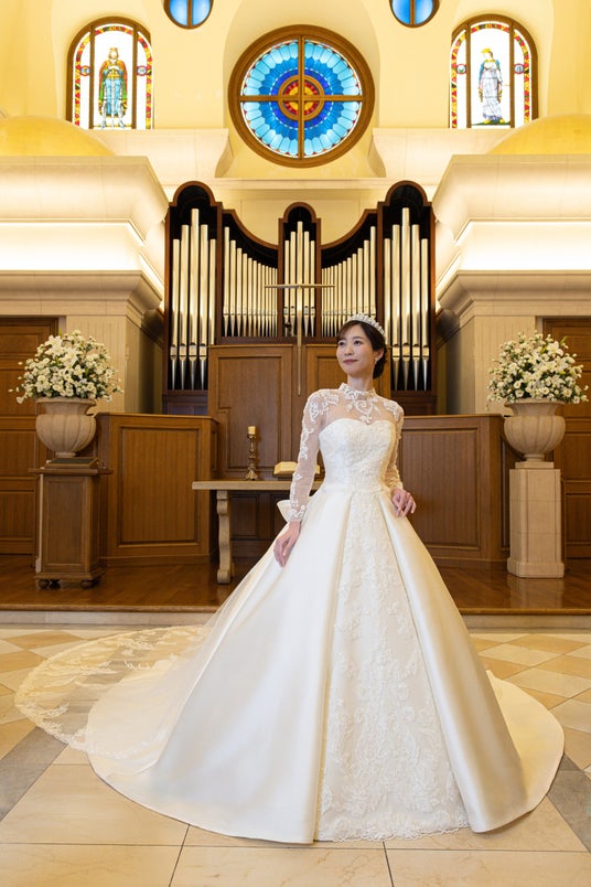 重厚な大理石やシャンデリアが煌めく格調高い空間に美しく映えるよう、上質なミカドサテンを贅沢に使用。さらに、花嫁様の動きに合わせて繊細に輝きを放つビージングレースと、立体的な刺繍が印象的なエンブロイダリーレースを巧みに組み合わせました。