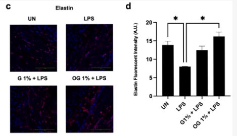 エラスチンの分解は、OG(オゾン化グリセリン)処理サンプルにおいて有意に抑制された。