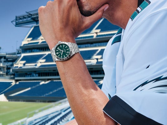 文字盤のカラーは各NFLチームのプライマリーカラーに合わせており、サンフランシスコ・49ersのモンタナレッドやフィラデルフィア・イーグルスのミッドナイトグリーンなど、どのモデルも手元でファン精神を最大限に体現します。コントラストを効かせたGMT針には、スティーラーズのゴールドやブロンコスのネイビーなど、各チームのセカンダリーカラーを採用。24時間表示スケールはトーンオントーン仕上げとし、GMT針の色が際立つよう工夫されています。さらに、NFLチームへの最後のオマージュとして、ケースバックには各クラブのロゴが刻まれています。