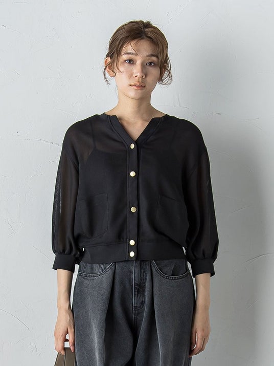 通気性がよく清涼感のある織りのメッシュ素材。夏はカーディガンでさらりと纏い、秋はプルオーバーとして。ゴールドボタンを煌めかせてスタイリングのワンポイントに。