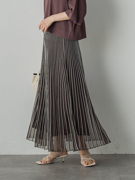 item03_Sheer Stripe Skirt裾にかけて広がるストライプ調のラインが華やかでドラマティックなニットならではのスカート。 ラインにシアーな糸をミックスさせたストライプの表情が軽やかで、プリーツスカートのような繊細さが旬なムードに。