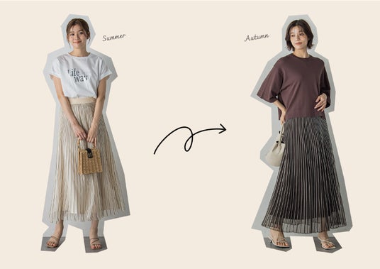 シアースカートはシーズンレスで使える万能アイテム。夏はロゴTを合わせて大人カジュアルで涼しげなスタイリングに◎秋はダークトーンをメインに、着るだけでこなれ感の出る五分袖ワイドシルエットニットで季節の変わり目にピッタリなスタイリングの完成。