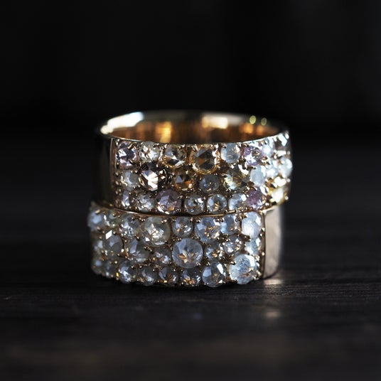 種類やサイズの異なるカラーストーンやダイヤモンドを、職人の手で隙間なく敷き詰めたパヴェジュエリー。半レール留めで石を守りつつ、丸みのある愛らしいシルエットと吸い付くような着け心地を両立しております。