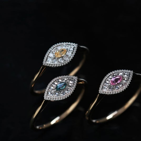 中央のマーキースを取り囲むのは、繊細なミルグレインと緻密な彫り留め。小さな宝石箱のように光を集め、胸元や指先でほのかな輝きを放ちます。石座の高さや地金の厚み、側面の透かしは、強度と快適な着け心地のために調整。爪は控えめな仕上げとし、透かしは光を引き込みながらも正面からは上品に見えるデザインとなっております。