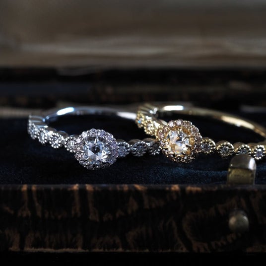 中央には瑞々しい輝きを湛えたローズカットやブリリアントカットのダイヤモンドを据え、その周囲を極小のメレダイヤで石座の縁ぎりぎりまで敷き詰め、花のようなシルエットを描きました。