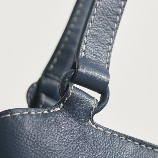 ハンドルと胴体をつなぐリングには金具を使わず、レザーでつくることで、ふっくらと優しい印象を細部まで感じていただけるようにしました。ハンドルの付け根は、特徴的な形にカットされたレザーと手縫いを組み合わせることで、胴体をリングに巻き付けハンドルとボディの美しい一体感をつくり、バッグ全体が継ぎ目なく、なだらかにつながっていきます。