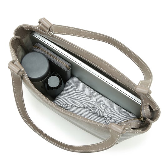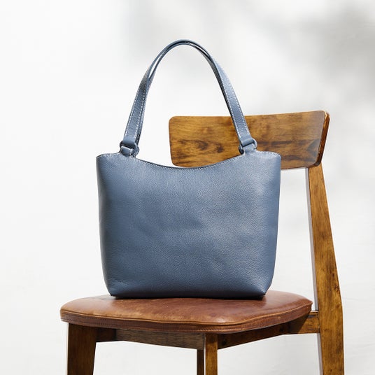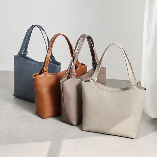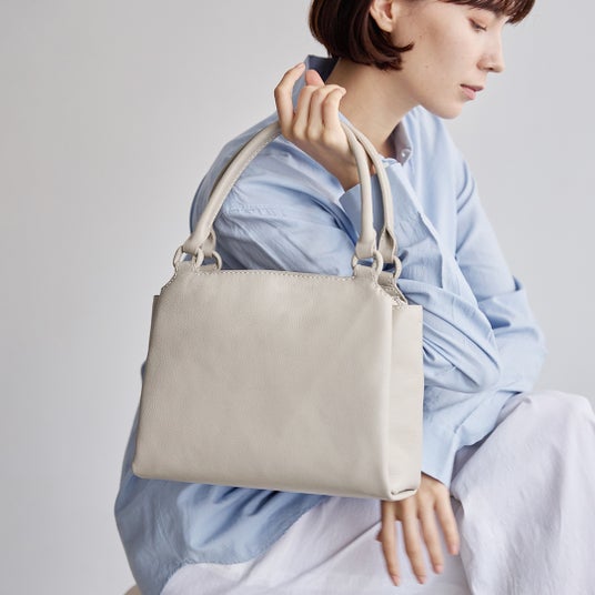 A4サイズが入り、お仕事でもカジュアルでも持ち歩ける「Yui Tote(ユイ トート)」。ななめに伸びるハンドルとカーブを描いた間口のラインが、心地よく身体にフィットします。