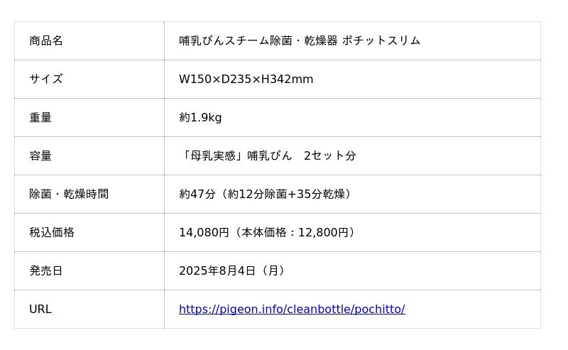 ピジョン株式会社(本社:東京、社長:矢野 亮)は、国内市場シェアNo.1(※1)を誇る洗浄消毒カテゴリーから、本体幅をわずか15cmに抑えた、哺乳びんの除菌~乾燥が全自動で完了する「哺乳びんスチーム除菌・乾燥器 ポチットスリム」を、2025年8月4日(月)より一部のベビー用品専門店、当社公式オンラインショップにて販売します。また、発売を記念し、抽選で6名様に本商品が当たるフォロー&リポストキャンペーンを開催いたします。