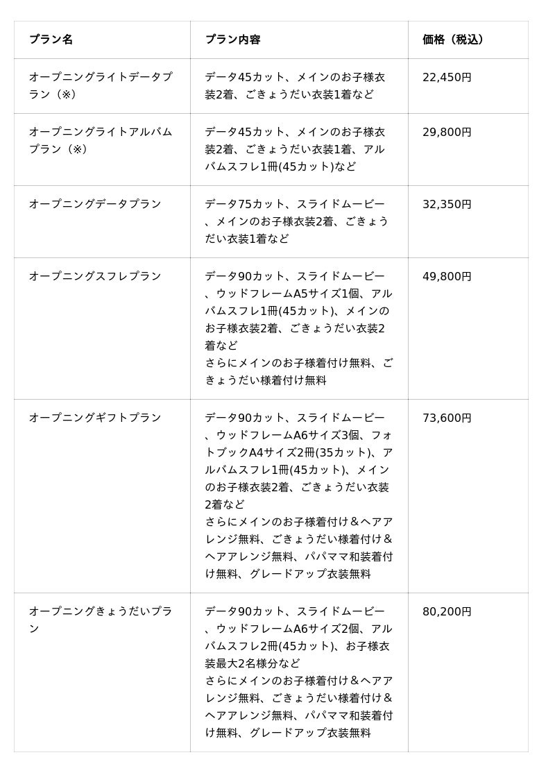 この度のオープンを記念し、特典付きの6種類のパッケージプランとイベントをご用意しました。バースデー、七五三、お宮参り、入園・卒園などシーンを問わずご利用ください。
