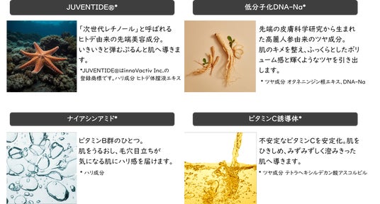 *1 JUVENTIDE(R)️はinnoVactiv Inc.の登録商標です。ハリ成分 ヒトデ体膣液エキス *2 ツヤ成分 オタネニンジン根エキス、DNA-Na ※ 乾燥などによりハリが失われている状態のこと