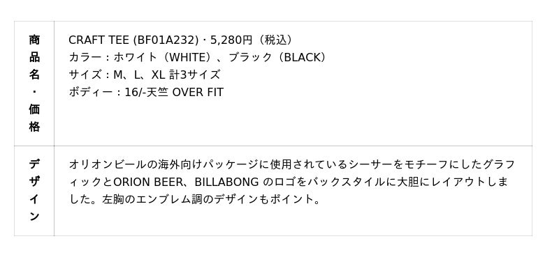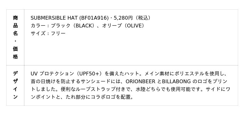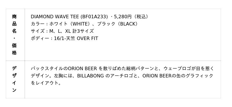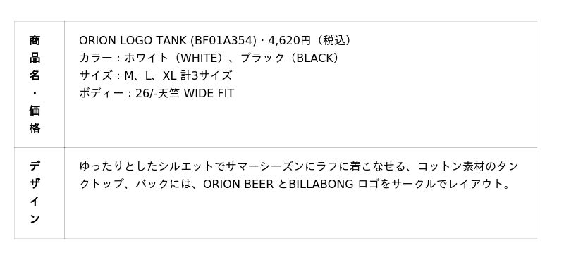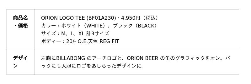 これから迎える夏本番のフェスやキャンプ、ビーチパーティーなどのアクティブなシーンに、ORION×BILLABONGのコラボアイテムを身に着け仲間達と楽しいひとときをお過ごしください。
