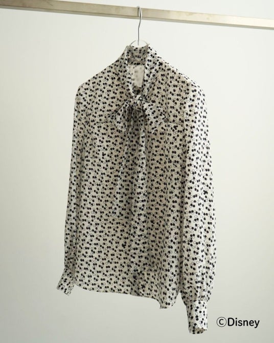 ドット柄に隠れミッキー&ミニーがプリントされたボウタイブラウス。柔らかなデシン素材を使用しています。ボウタイは取り外しが可能でアレンジもできるデザインです。