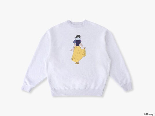 歴代の個性豊かなプリンセスたちの中から、白雪姫、シンデレラ、オーロラ姫、アリエル、ベル、ジャスミン、ラプンツェルの7プリンセスをピックアップし、特長的なバックスタイルのアートワークをユーズド感のあるクラックプリント加工したスウェットプルオーバー。