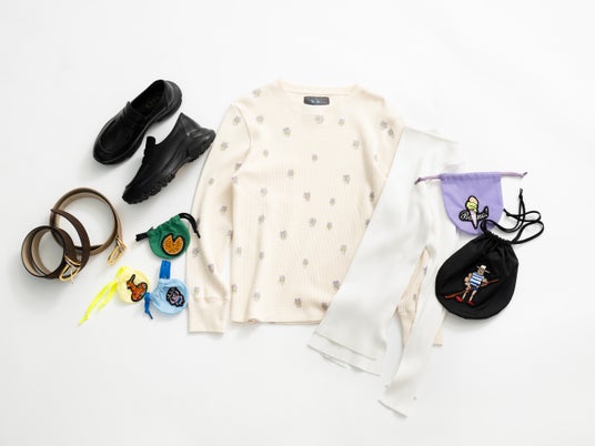 (左) aLORS /Belt (左上) TOD’S / Leather Sneaker (左下) LUDLOW / Pouch (中央) RH Vintage / Waffle Sumire Long Sleeve Tee (中央右) AURALEE for Ron Herman / Long Sleeve Rib Knit
