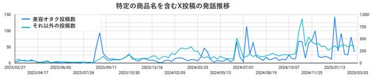 続いて、特定の商品名を含むX投稿を、美容オタクによる投稿と、それ以外の投稿の二種類に分類しました。2023年2月27日から2025年3月2日の期間において、前者と後者の投稿数の関連を調べたところ、美容オタクによる投稿数の増加が、投稿全体の増加を押し上げていることが分かりました。