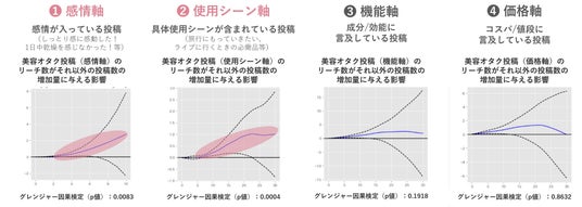さらに、美容オタク投稿のうち、特にどのような内容が投稿の増加に影響を与えているのかを調査しました。分析の結果、「感情軸」「使用シーン軸」に分類される投稿のリーチ数が、投稿全体の増加に影響を与えていることが分かりました。例えば、「感情軸」は「しっとり感に感動した」、「使用シーン軸」は「旅行に持っていきたい」といった投稿です。一方、商品の成分や効能に言及している「機能軸」やコストパフォーマンスや値段に言及している「価格軸」に分類される美容オタク投稿は、投稿全体の増加にはあまり影響がないことも分かりました。理由としては、「感情」や「使用シーン」を含む美容オタク投稿の方が実感として分かりやすいことから、美容感度があまり高くない多くの人にとってより自分ごと化しやすいためだと考えられます。
