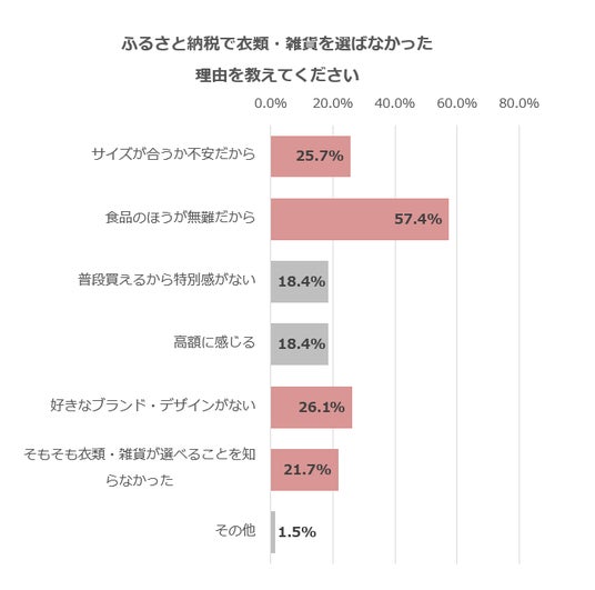 ふるさと納税で衣類・雑貨を選ばなかった方(n=272)に理由を聞いたところ、最も多かったのは「食品のほうが無難だから」(57.4%)でした。