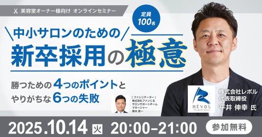 お客さまの声を最先端の分析でファン増加につなげる企業、株式会社ファンくる(本社:東京都千代田区、代表取締役社長:山口敬人)は株式会社レボル(本社:埼玉県川口市、代表取締役社長:平井伸幸)の平井社長をお迎えし、「中小サロンのための新卒採用の極意 ~勝つための4つのポイントとやりがちな6つの失敗~」 (定員:100名/無料)を10月14日(火)に開催いたします。(申し込み先:https://biz.fancrew.jp/seminar20251014_contact?=pr1)