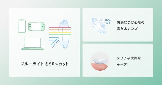 レンズにブルーライトを吸収する成分を配合し、PCやスマホを多く使う現代のライフスタイルに対応した機能設計です。