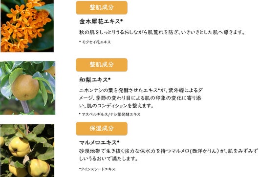 夏の紫外線でダメージを受けた肌は、秋になると“くすみ※1”や“ゴワつき”※2として表面化しはじめます。さらに気温の低下や寒暖差によって、バリア機能や保湿力も低下することで「秋の隠れ敏感肌」に。そこで今回「プレミアムルルルン 金木犀 (キンモクセイの香り)」は、季節の変わり目でゆらぎがちなお肌をすこやかに整える「金木犀花エキス*1」に加えて、夏の居残りくすみ※1をケア※3する「和梨エキス*2」を新しく配合しました。移ろう季節に、肌と香りで感じる特別なケアをあなたにお届けします。