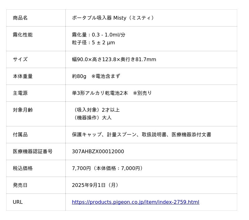 ピジョン株式会社(本社:東京、社長:矢野 亮)は、水道水や生理食塩水を約5マイクロメートルの微細なミストにし、吸入することでのどや鼻を優しく潤す、2才から使える家庭用超音波吸入器(※1)「ポータブル吸入器 Misty(ミスティ)」を、2025年9月1日(月)より、ピジョン公式オンラインショップ本店(https://shop.pigeon.co.jp/)と、各オンラインショップ公式店(※2)、Amazonにて販売いたします。