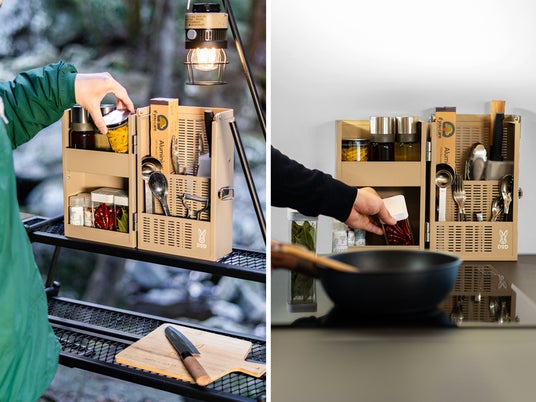 シェフレルシェルフLITE包丁やまな板、調味料をまとめてキャンプに持ち出せるキッチン専用ラック。家のキッチンにも置けるインテリアライクなデザインのため、家で使っている道具をそのままアウトドアに持ち出せます。