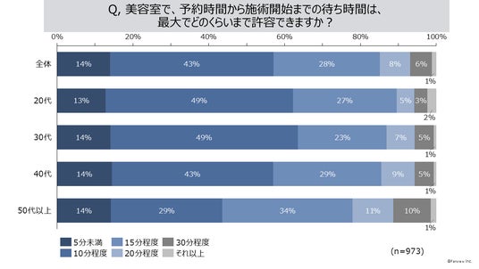 1.予約から施術開始までの待ち時間で許容できるのは「10分程度」43%