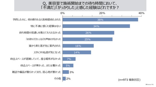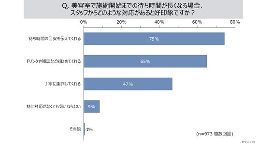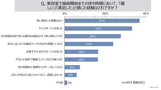 - 施術開始までの待ち時間で嬉しかった、満足した経験は「ドリンクサービスがあった」「待ち時間の目安や待つ必要がある理由などを丁寧に説明してくれた」、不満だった、がっかりした経験は「予約したのに、何の断りもなく長時間待たされた」