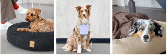 展示商品:ペット用ベッド、お散歩アイテム、ブランケットなど