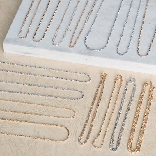 2~3種類のチェーンを組み合わせてつくった、ミックスチェーンのブレスレットとネックレスが登場しました。チェーンごとに煌めき方が異なり、動きに合わせて光がランダムに瞬く様子が魅力です。