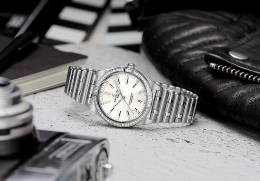 スタイリッシュでありながらエレガントなクロノマットオートマチック 36は、どんなシーンにも合うスポーティーでシックなモデル。本作は36mmのステンレススチールケースに、ダイヤモンド装飾を施したベゼルやインデックスのダイヤルが目をひきます。アイコニックなルーローブレスレットの着け心地は抜群。クロノマットオートマチック 36は、COSC認定のクロノメーターのブライトリングキャリバー10を搭載しています。(税込価格124万3000円)※2025年11月時点