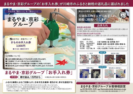 当社の『きものお手入れ券』は、川崎市だけでなく京都市でもふるさと納税返礼品として、対応しています。ぜひご利用ください。