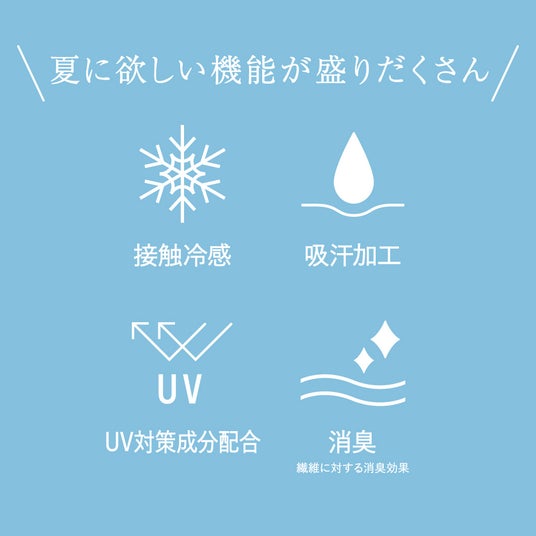 特殊な断面形状で熱を逃がす力が大きい糸を採用しているため涼感効果があります。これにより素足より―1℃(※)の涼しさを実現しました。糸自体が涼感効果を持ち、洗濯後も涼しさが持続します。さらにひんやり涼しい肌触りの接触冷感機能も備えています。