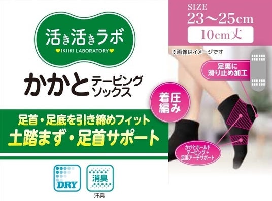 かかとテーピングソックスかかと周りのテーピングが足首を引き締め、靴下内のズレを軽減し、歩きやすくします。
