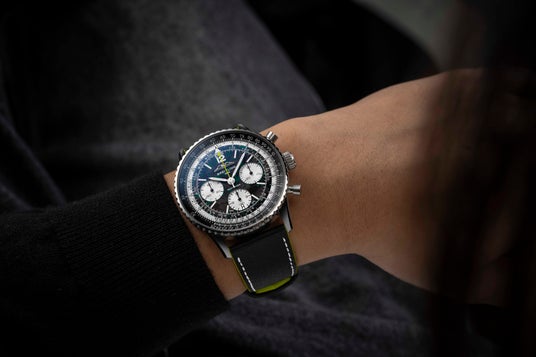 ナビタイマー B01 クロノグラフ 43 ASTON MARTIN ARAMCO FORMULA ONE(TM) TEAM のあらゆる要素は、パフォーマンスを体現しています。アストンマーティン・アラムコの外装デザインに着想を得たアストンマーティン・レーシンググリーンとライムのアクセント、ナビタイマーで初めて採用された軽量なチタン製ケース、そして F1(R) マシンのコックピットに用いられる素材からインスピレーションを得たカーボンファイバー製ダイヤルが、その象徴です。型押しを施したレザーストラップはレーシングハーネスを想起させます。また、夜間の視認性にも優れ、あらゆる状況下で時計が読みやすくなっています。