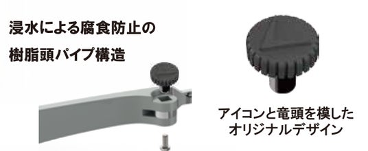 タフに強く、長持ち安心フロントとテンプルを繋ぐ丁番には、通常のネジのみではなく、運動などによる汗や水の浸水による腐食防止の樹脂頭パイプ構造で錆びにくくなりました。これによりネジ頭が壊れることによる調整できないトラブルを解消しました。