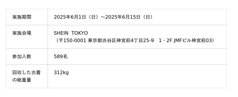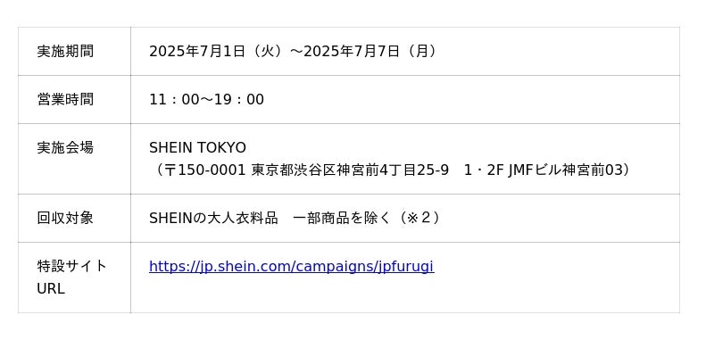 この度、第12弾『#SHEIN Again』を2025年7月1日(火)~2025年7月7日(月)に「SHEIN TOKYO」にて開催します。『#SHEIN Again』に参加するためには、キャンペーンの応募ページ(https://jp.shein.com/campaigns/jpfurugi)から事前に応募いただいた上で、「SHEIN TOKYO」へ古着をご持参いただき、店頭でキャンペーンにご参加いただきます。今回の交換アイテムに洋服以外のアイテム(シューズ、バッグなど)も含みます。さらに、SNSに投稿いただくと、追加で1点プレゼントがもらえるキャンペーンも実施いたします。