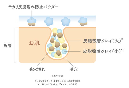 ○テカリ・皮脂崩れ防止パウダーと大小サイズの異なる皮脂吸着クレイのダブル皮脂コントロール成分*¹配合で、テカリ・皮脂崩れを防ぎサラサラ肌へ
