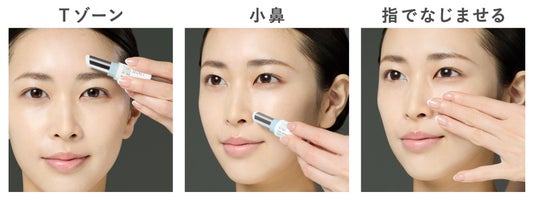 Tゾーンや小鼻などのテカリや皮脂崩れが気になる部分に直接のせた後、指の腹を使い、やさしくたたきこむようになじませます。