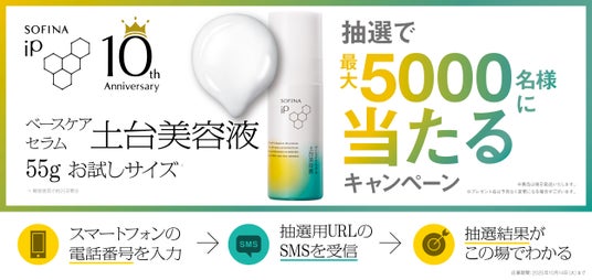 全国のドラッグストア、SOFINA iPコーナーにて、二次元コードからアクセスいただき、ご応募いただいた方の中から、抽選で最大5,000名様に、土台美容液(R)(55gお試しサイズ)をプレゼントいたします。InstagramやLINE公式アカウントからも情報発信予定です。