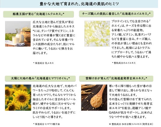 日本一の酪農文化を誇る北海道。果てしなく広がる牧草地、澄み渡る空気、そして厳冬を越えキラキラと輝き出す春の雪解け水。そんな雄大な大地で育まれた「北海道ミルク」など、肌にもうれしい栄養がたっぷり詰まった北海道の恵みをギュッと贅沢に配合しました。ほんのり甘い北海道ミルクの香りで肌を包み込み、しっとり健やかなうるおい肌へと導きます。
