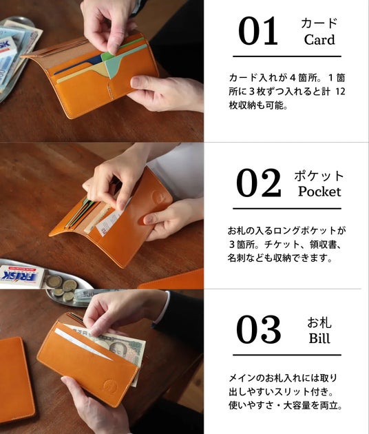 4つのカードポケットがあり1つのポケットに最大3枚収納できるので、4枚~12枚のカードを収納可能。3つのロングポケットには紙幣のほか、航空券や領収書、名刺なども収まります。