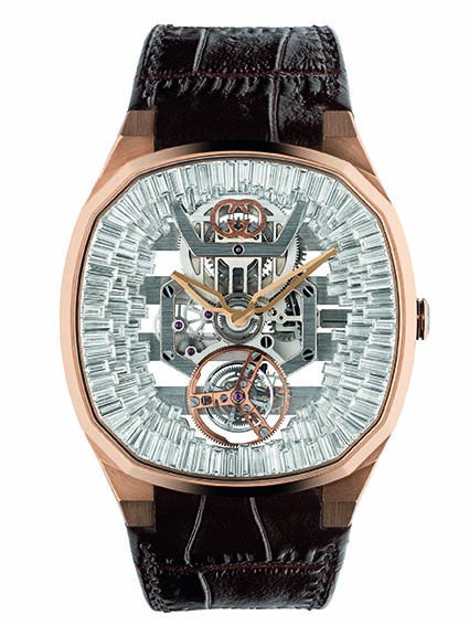 全体に直径が異なるダイヤモンドをふんだんにあしらったケースは、まわりの光を受けてまばゆい煌めきを放ちます。革新的な多層構造のブラックのダイアルには、スモーク サファイアガラスの下に手作業でラッカー仕上げを施したアワーディスクを配置し、ガラスの開口部から 特定の時間だけがはっきりと見えるようになっています。虹色に輝くアベンチュリンガラスの奥にはミニッツディスクが背面のローターと同期して軽やかな動きを見せます。ブラックのアリゲーター ストラップが気品あふれるデザインを完成させます。