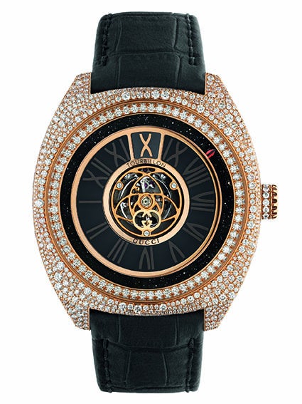 2024年に誕生した〔グッチ インターロッキング〕コレクションに新たに加わるのは、サイズの異なるダイヤモンドを手作業でモザイク状にセッティングした 41mmのローズゴールド モデルです。これまでのモデルと同様に、新作も10.7mm厚のクッション シェイプ ケースを採用し、インターロッキングG をあしらったフライングトゥールビヨンとジャンピングアワーという2つの複雑機構を搭載しています。