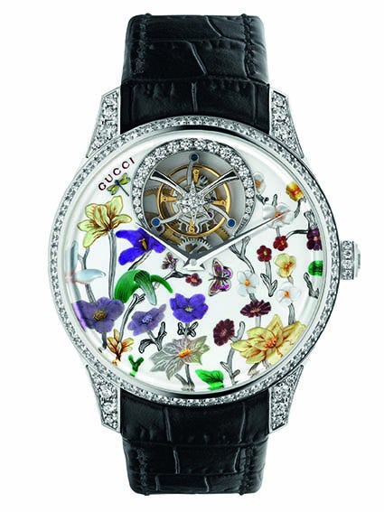 1つめのモデルは、イタリアのアーティストでイラストレーターのヴィットリオ・アッコルネロ・デ・テスタがグッチのスカーフのために描いたアイコニックな「フローラ プリント」を、ホワイトゴールド、ダイヤモンド、ホワイトのグランフー エナメルが奏でる花々のシンフォニーへと昇華させました。ボタニカルモチーフの繊細な彫刻、手描きで緻密に彩色された花々、ハンドエングレービングによるバイオレットジェイドやマザー・オブ・パール、ヴァーダイトといった天然素材やジェムストーンの象嵌が施されています。そしてブラックのアリゲーター ストラップがそのエレガントなデザインを完成させています。
